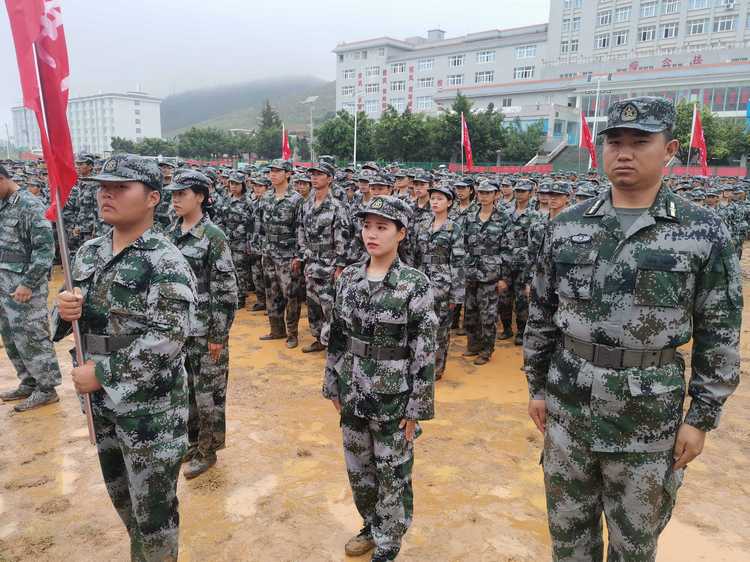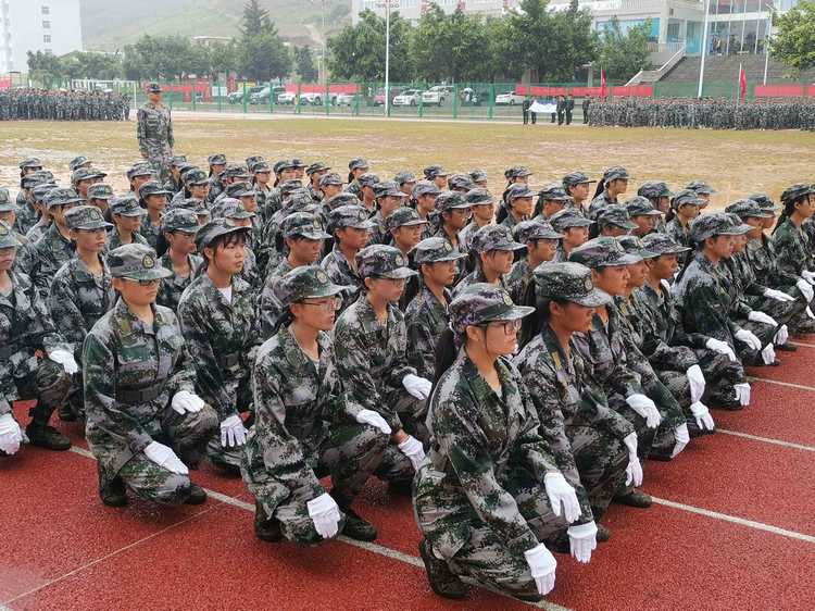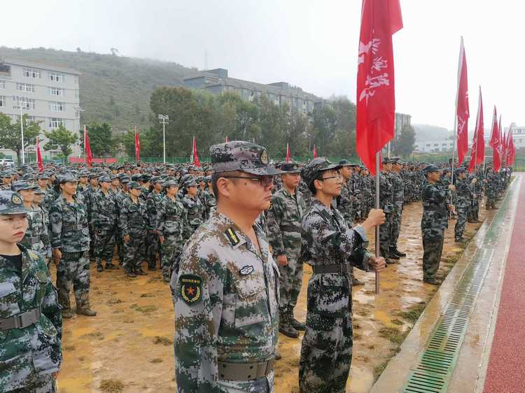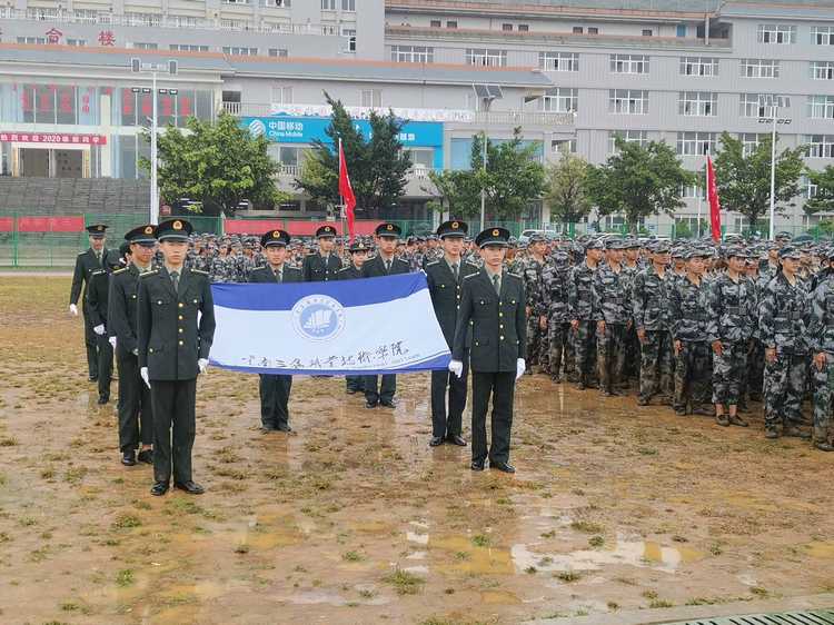 雖然天空不做美,茫茫秋雨,淅淅瀝瀝地下著,但是絲毫沒有影響受訓(xùn)新生的心情,伴隨著莊嚴(yán)的國歌,新生們身穿整潔軍訓(xùn)服裝,站著標(biāo)準(zhǔn)軍姿,昂首挺胸,陽光向上,目光如炬,朝氣蓬勃。