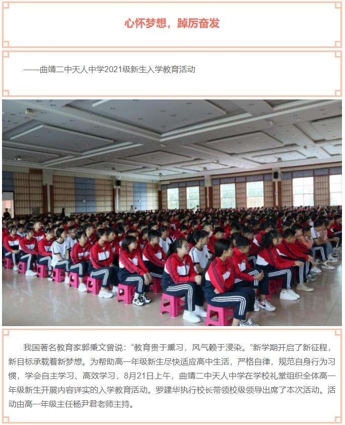 2021-08-27遵校紀(jì)樹學(xué)風(fēng),構(gòu)建文明天人——曲靖二中天人中學(xué)高一新生入學(xué)教育系列活動(二)“誠取天地正氣問人間暖涼,法引規(guī)矩方圓律世間萬象”。為了貫徹立德樹人的根本任務(wù),踐行曲靖二中天人中學(xué)...