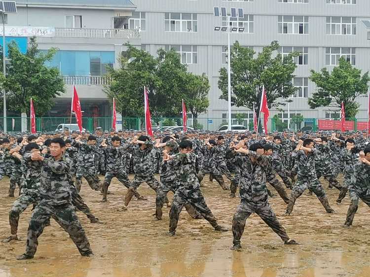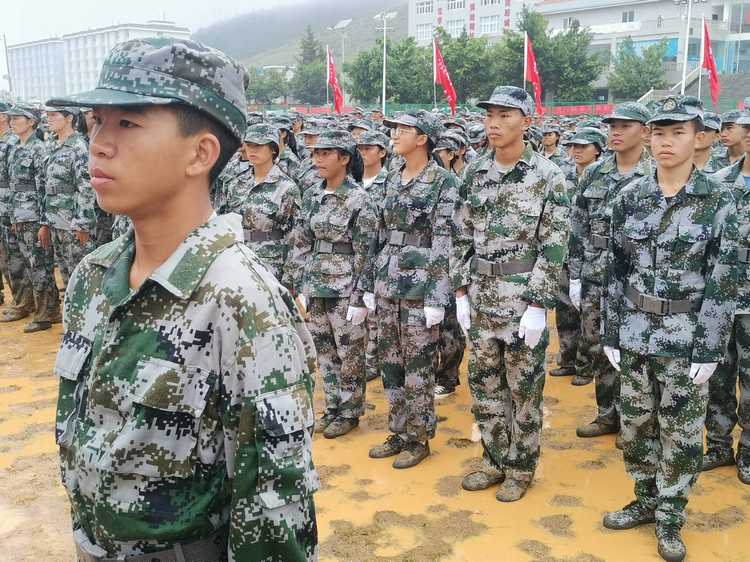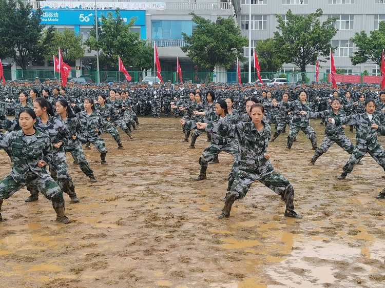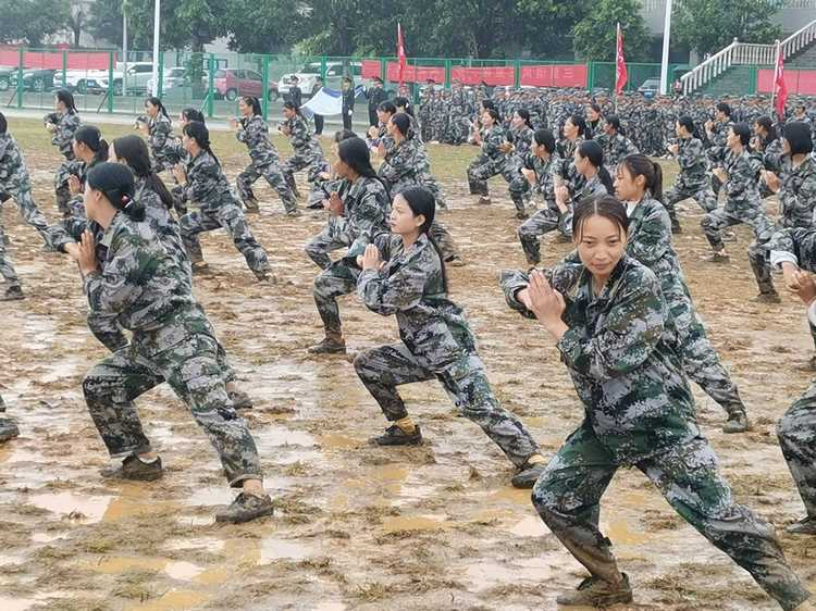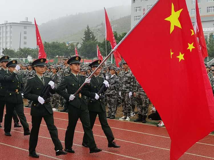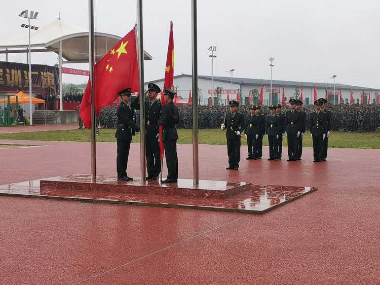 雖然天空不做美,茫茫秋雨,淅淅瀝瀝地下著,但是絲毫沒有影響受訓新生的心情,伴隨著莊嚴的國歌,新生們身穿整潔軍訓服裝,站著標準軍姿,昂首挺胸,陽光向上,目光如炬,朝氣蓬勃。