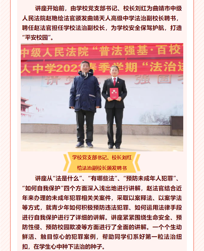 曲靖天人高級(jí)中學(xué)開(kāi)展“普法強(qiáng)基,法護(hù)青春”法治教育專(zhuān)題講座