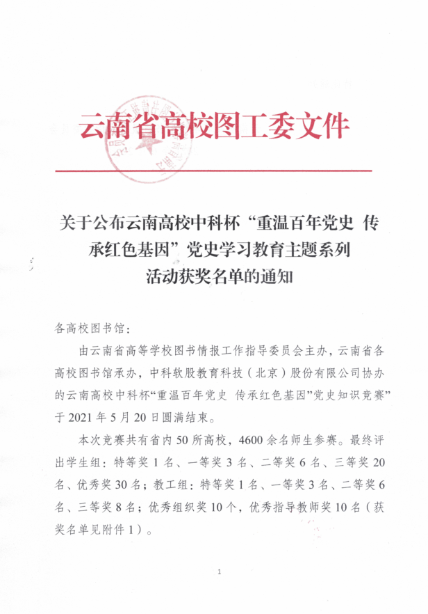 近日,由云南省高等學(xué)校圖書情報(bào)工作指導(dǎo)委員會(huì)主辦,云南省各高校圖書館承辦,中科軟股教育科技(北京)股份有限公司協(xié)辦的云南高校中科杯“重溫百年黨史傳承紅色基因”黨史知識(shí)競賽”圓滿結(jié)束。